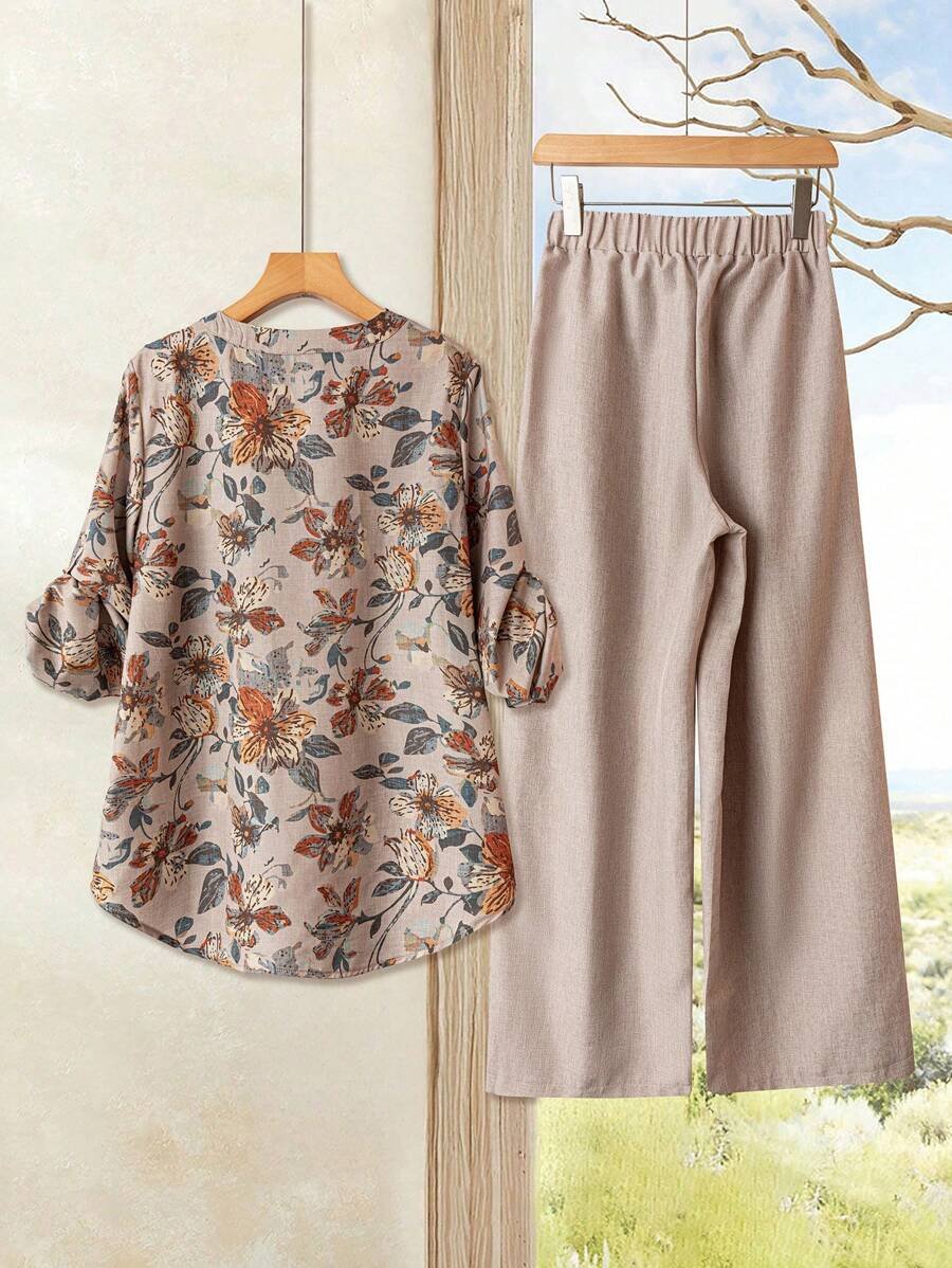 - اسم المنتج: سيت نسائية من بلوزة بتصميم زهور وبنطلون سادة